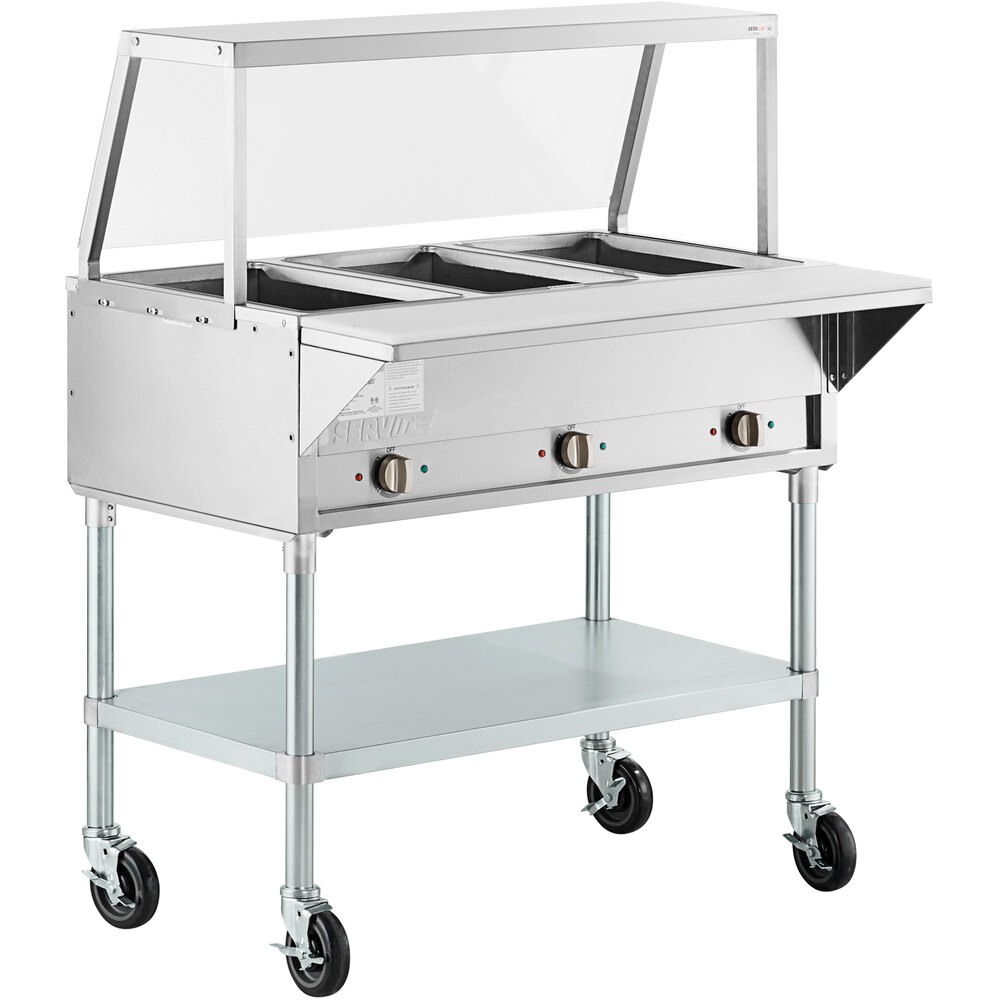 Keep all of your menu items piping hot and readily available with this ServIt three pan open well electric steam table with angled sneeze guard and casters!