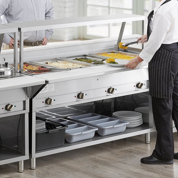 The steam table includes a partially-enclosed base to securely store extra serving utensils, food pans, or lids to keep all the tools you need close at hand.