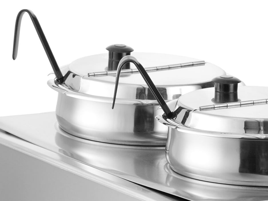 To ensure success upon opening, this package features 2 stainless steel hinged covers and 2 ladles.
