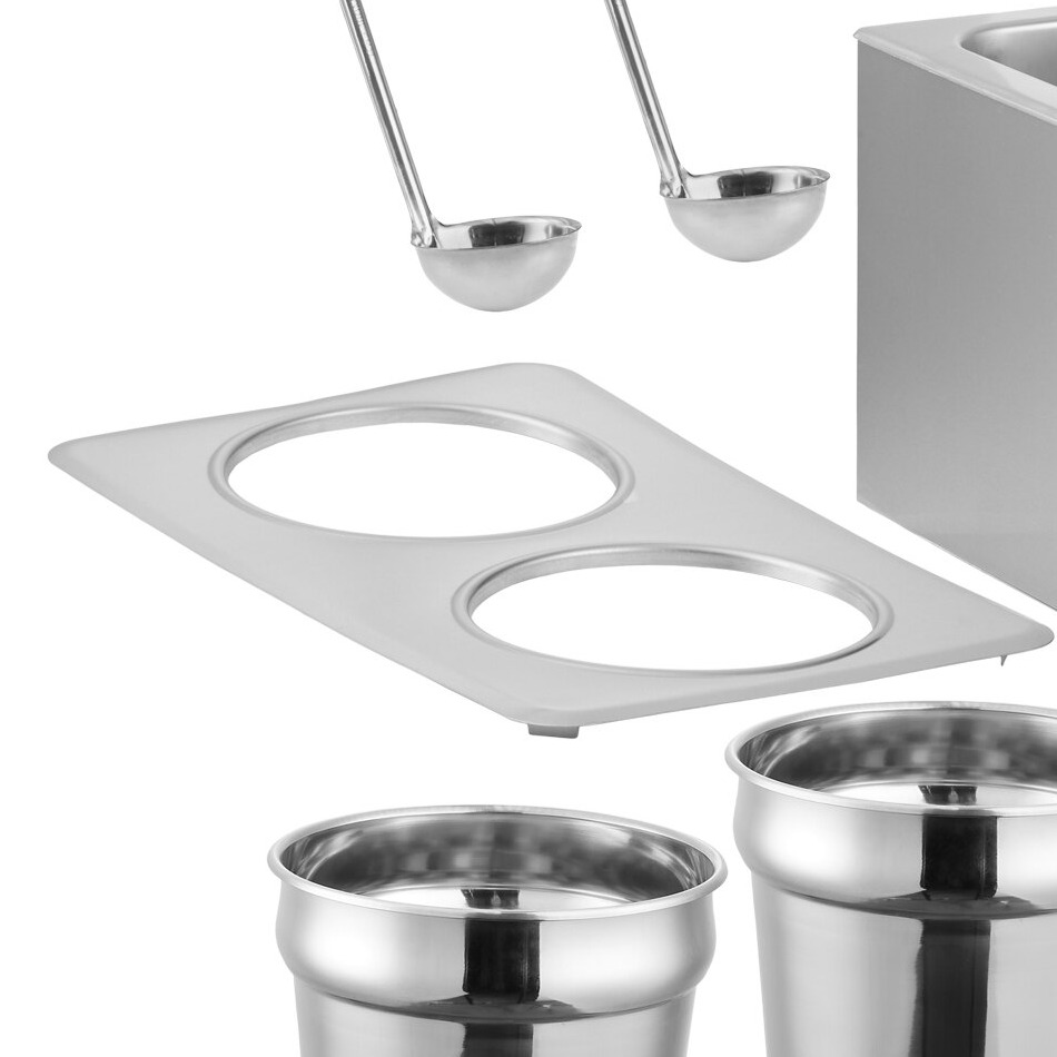 This kit comes complete with a 2 hole steam table adapter plate, making it easy to adapt your warmer to fit changing needs and changing menus. The plate fits over a full size 12" x 20" pan opening and contains (2) 8 3/8" diameter holes, which are compatible with the included (2) 7.5 qt. round vegetable inset pots.