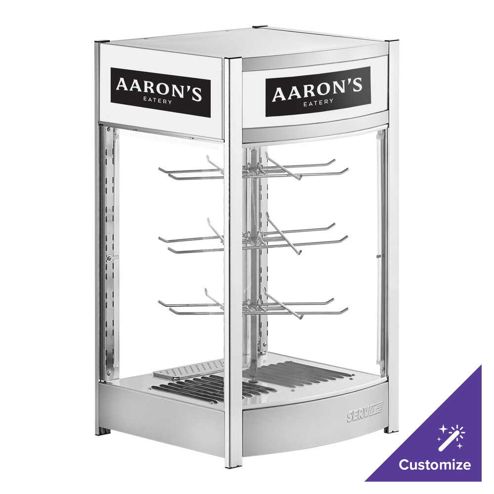 Keep your pizzas hot, fresh, and ready to enjoy by choosing this ServIt PDW12D1PC 12" full-service pizza warmer with rotating 4-shelf pizza rack, pretzel rack, and customizable panels.