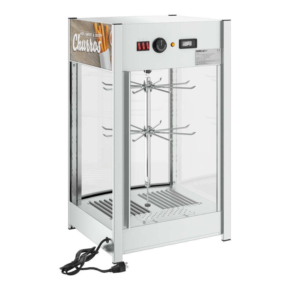 This countertop warmer offers a chrome-plated rotating rack that can hold up to (4) 12" pizzas. Add this unit to your pizza shop, kiosk, convenience store, concession stand, movie theater, or food truck to hold freshly made churros and other hot foods and show them off to your customers.