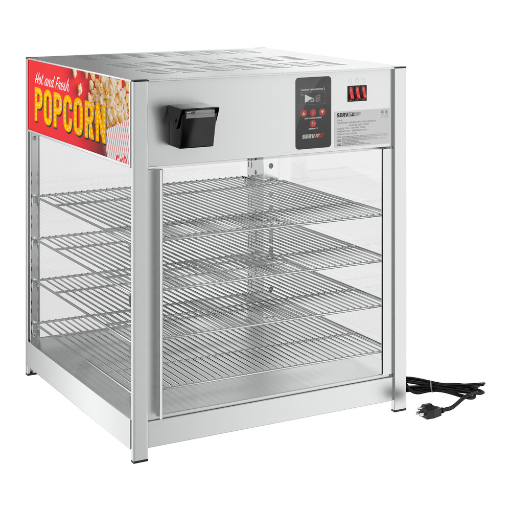Keep your popcorn and other packaged snacks hot, fresh, and ready to enjoy by choosing this ServIt 18" popcorn full-service countertop display warmer with 4 shelves.