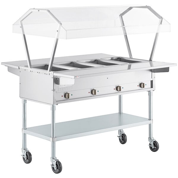 Two Pan Open Well Electric Steam Table with 2-Sided Sneeze Guard, (2) Drop Down Tray Slides, and Casters - 120V, 1000W